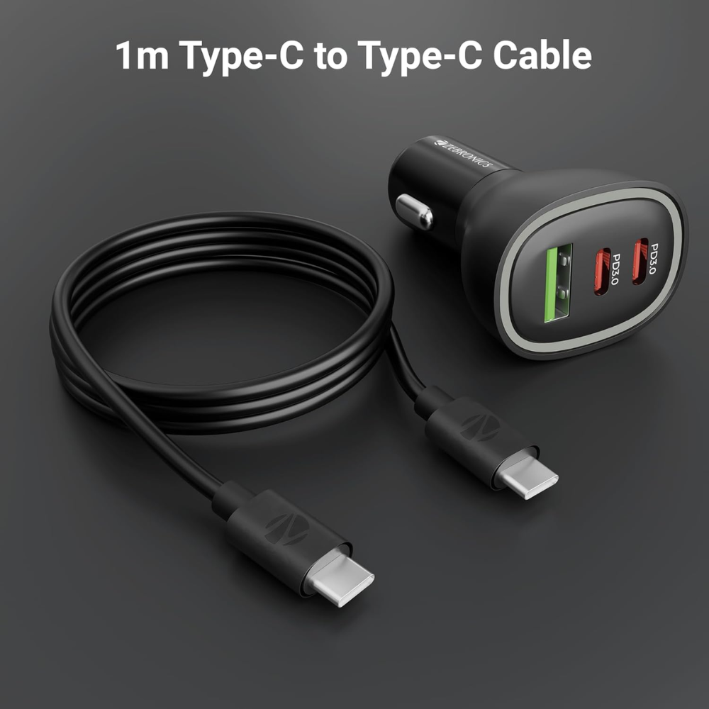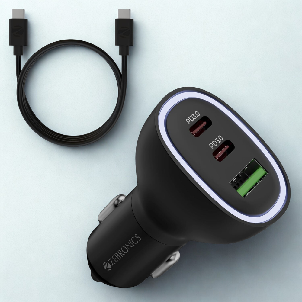 Zebronics 78W Multi-Port Car Charger with Dual Type-C, USB & 60W Cable